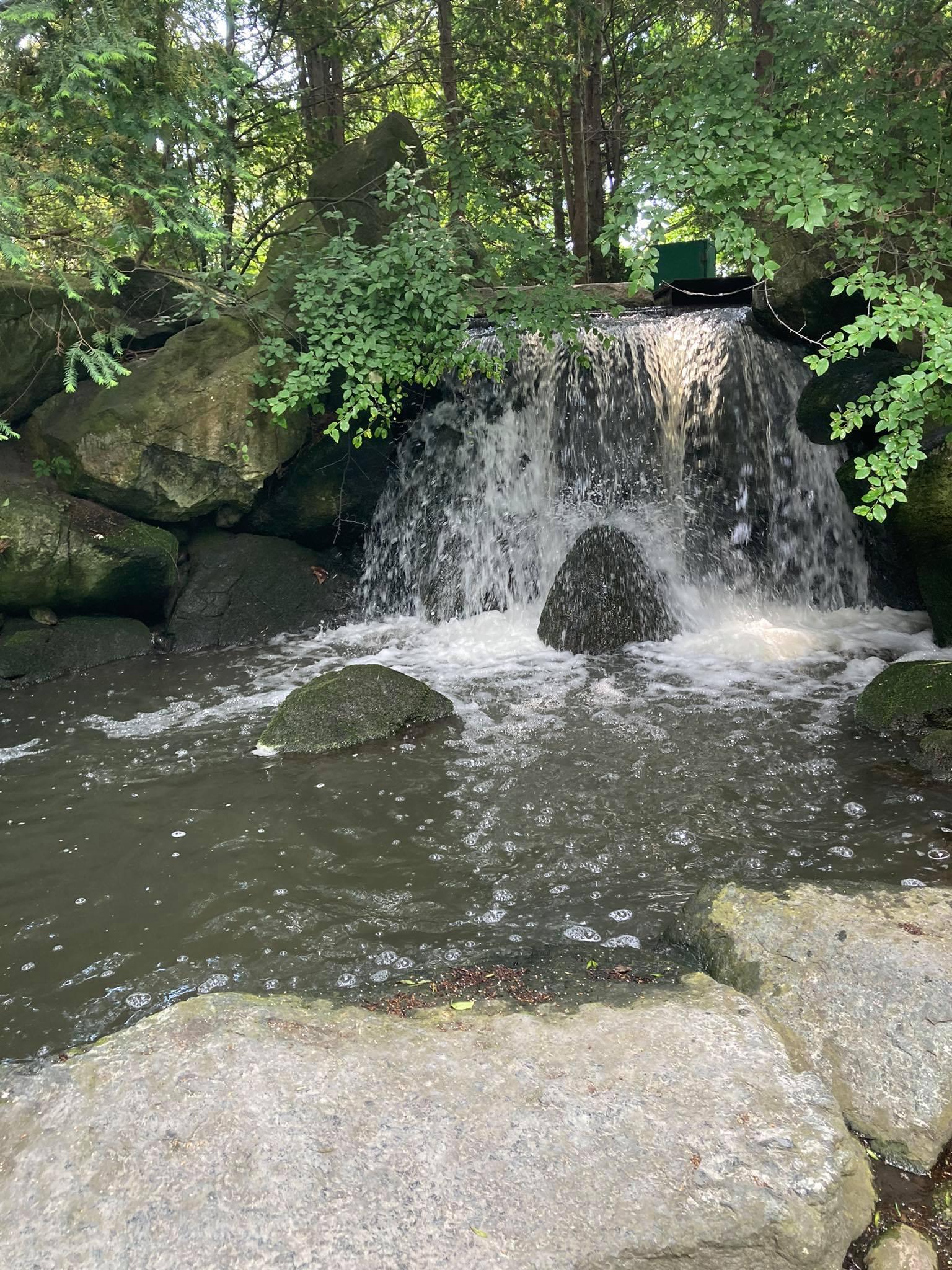 Dużą część ogrodu zajmuje jezioro. Stojąc na pomoście, podziwiać możemy kolorowe karpie koi oraz rośliny wodne. Na środku jeziora znajduje się wysepka z drzewkiem bonsai.